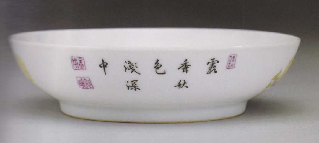 这对碟敛口、浅弧壁、矮圈足。器内平素无纹,二碟器外壁一面彩绘重瓣黄菊花数枝,花瓣绘法符合雍正皇帝要求的「珐琊菊花瓣画单了,嗣后照千层叠落花瓣昼」审美标准。另-面以墨书写有「露香秋色浅深中」 诗句,此句引用自明朝刘崧《题超上人墨菊》七言绝句之首句。诗句前有「佳丽」,后有「金成」、「旭映」共三枚红料印。器底带「雍正年制」二行蓝料宋体字双方框款。此对碟可能为雍正十年九月八日造办处档案中做得之「白地黄菊花三寸碟一对」。
