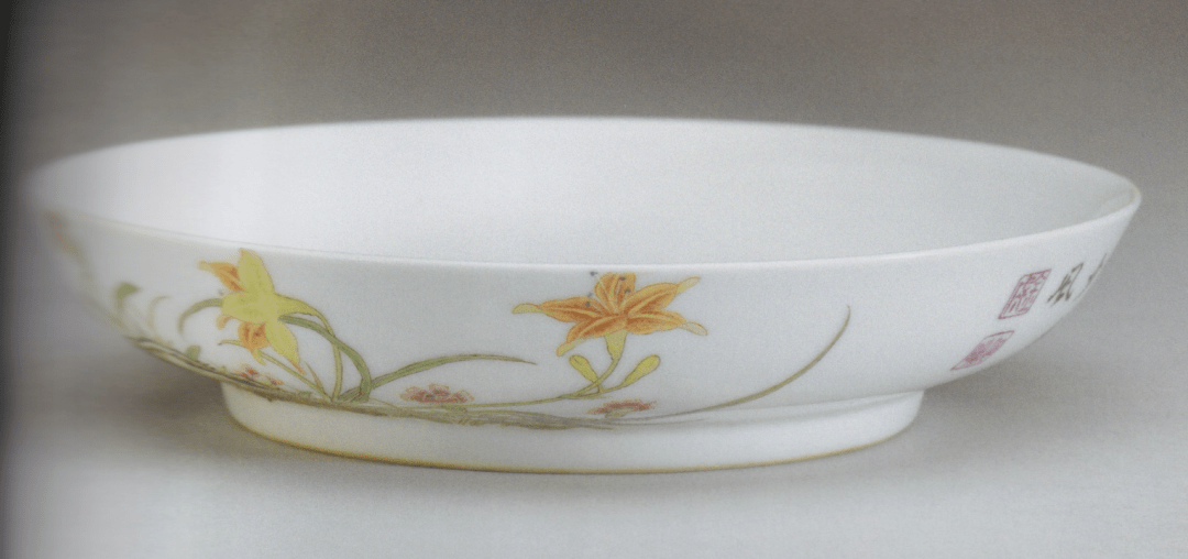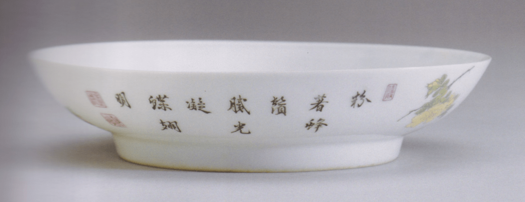 这对碟敛口、浅弧壁、矮圈足。器内平素无纹,二碟器外壁一面以赭墨画湖石,石旁开有黄色萱花及剪秋罗(石竹),并有二双蜜蜂飞舞其间。另面以墨书写有「色湛仙人露,香传少女风」诗句,二句引用自唐朝李峤<萱〉五言律诗之颈联。诗句前有「佳丽」,后有「金成」、「旭映」共三枚红料印。器底带「雍正年制」二行蓝料宋体字双方框款。