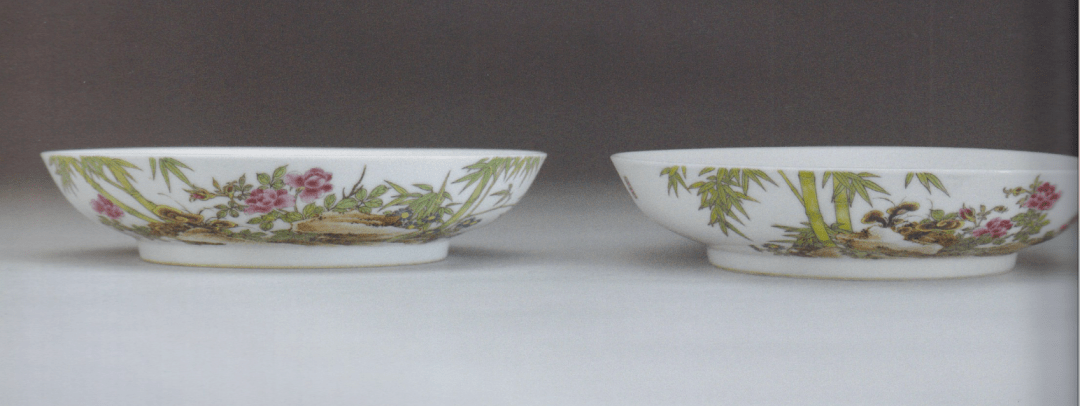 这对碟 敛口、 浅弧壁、 矮圈足。器内平素无纹,器外壁施洋红地,其上绘绿竹数竿,近口沿及圈足处竹叶摇曳,布局别缴。器底带「雍正年制」二行蓝料宋体字双方框款。