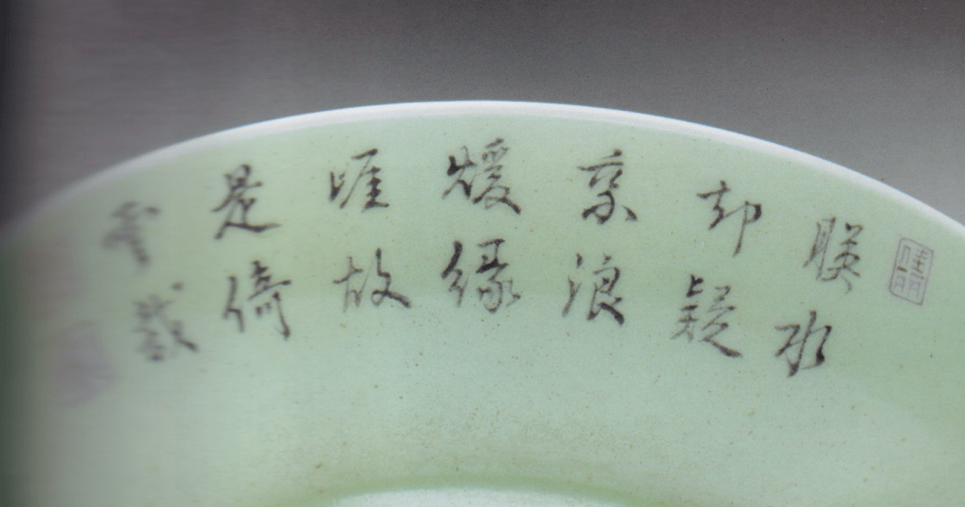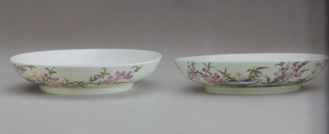 这对碟敛口、浅弧壁、矮圈足。器内平素无纹,外壁施浅绿色釉,其中一件较青翠,-件较浅淡。釉表, 尤其题字一面杂质较多。器外壁一面彩绘粉色 桃花二枝、低矮翠竹、蓝色奇石与多彩灵芝,二件除花朵疏密有别,构图几乎完全相同。另-面以墨书写有「晓水却疑乘浪媛,绿崖故是倚云栽」诗句,二句引用自明朝申时行《桃花》七言律诗之颔联。诗句前有「佳丽」,后有「金成」、「旭映」共三枚红料印。器底带「雍正年制」二行蓝料宋体字双方框款。