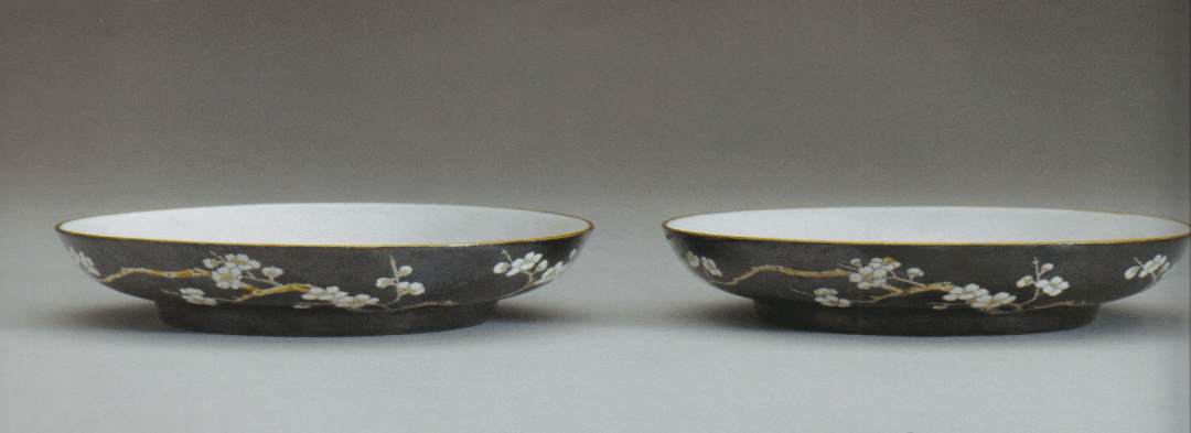 清 雍正珐琅彩瓷黑地白梅碟一对