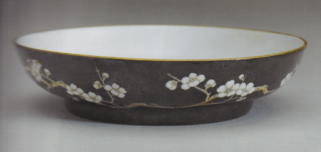 这对碟侈口、浅弧壁、矮圈足。器物口沿涂有一道金边,器内平素无纹,釉色略带灰黄。二碟器外壁以黑色为地,彩绘梅树一株,其上开满白梅。器底带「雍正年制」二行蓝料宋体字方框款。此对瓷碟可能马雍正十年八月十二日造办处档案中画得知「画黑地白梅花四寸磁碟一对」。