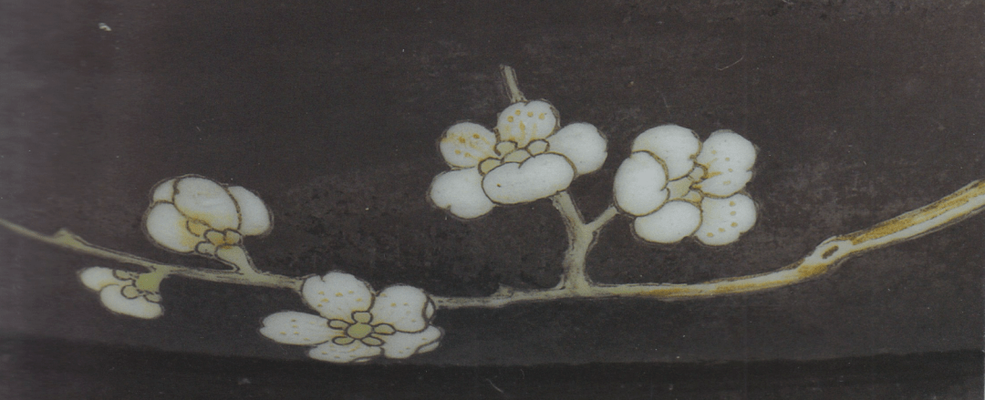 经显微放大两百倍后,可观测到梅花花瓣与蓝地之间的间隔无透明釉,说明此件作品马涩胎上彩绘珐琅料。