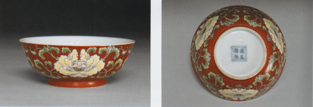 这件碗侈口、浅腹、 矮圈足。器内平素无纹,外壁以红色乌地,彩绘内紫外黄牡丹三朵,大花之间并间饰以绿、紫卷草。器底带「雍正御制」二行青花楷书双方框款。