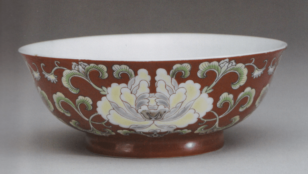 这件碗侈口、浅腹、矮圈足。器内平素无纹,外壁以红色马地, 彩绘内紫外黄牡丹三朵,大花之间并间饰二题、紫卷草。器底带「雍正御制」二行青花楷书双方框款。