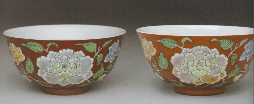 这对碗侈口、深腹、矮圈足。器内平素无纹,外壁以红色马地,彩绘紫、蓝、黄三色牡丹,大花之间并间 饰有蓝、 红、菊花各式花卉以及缠枝绿叶。器底带「雍正御制」二行青花楷书双方框款。