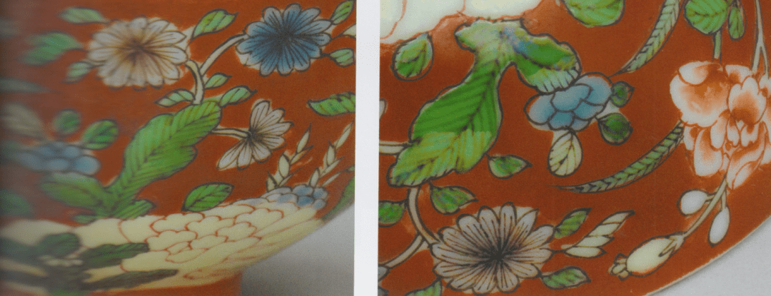 透过显微放大五十倍的观察,红花与红地色调偏橘,暗沉无玻璃质感,属景德镇传统矾红彩的应用。