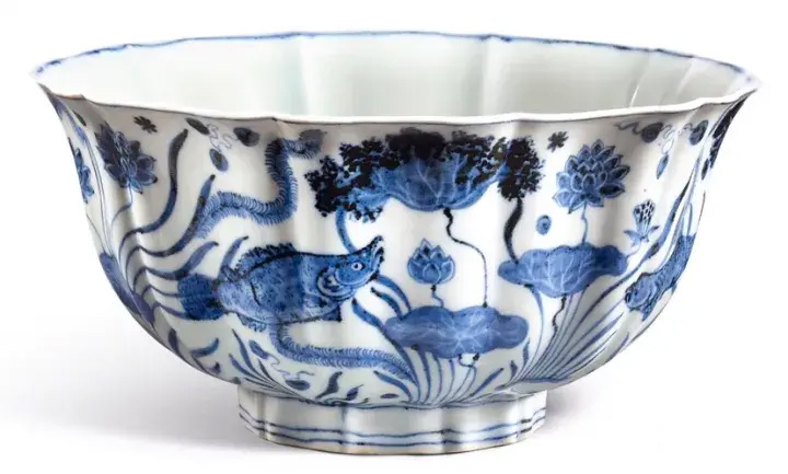 明宣德 青花鱼藻纹十棱菱口大盌 《大明宣德年制》款,23 公分(图源:香港苏富比官网)成交价:229,037,500 港币(创明初瓷器世界拍卖纪录)