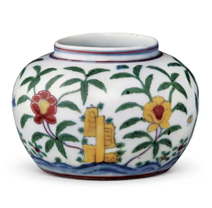 斗彩花蝶纹罐明成化(公元1465—1487年)高9.3厘米,口径7.4厘米,底径9.4厘米,中国国家博物馆藏;