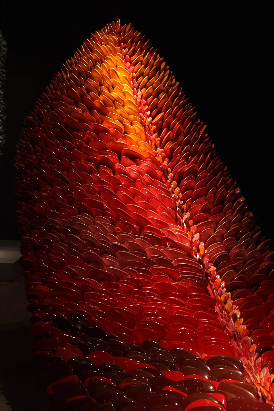 《大暑》是二十四节气中的第十二个节气,是一年中日照最多、最炎热的节气,“湿热交蒸”在此时到达顶点。该作品以陶瓷为主要材料,数千片可拆卸的瓷片单体,吸附在流线型的载体之上,每一片都经过1350摄氏度的高温手工烧造,以朱砂红主色,映托出大暑之炎热气息。