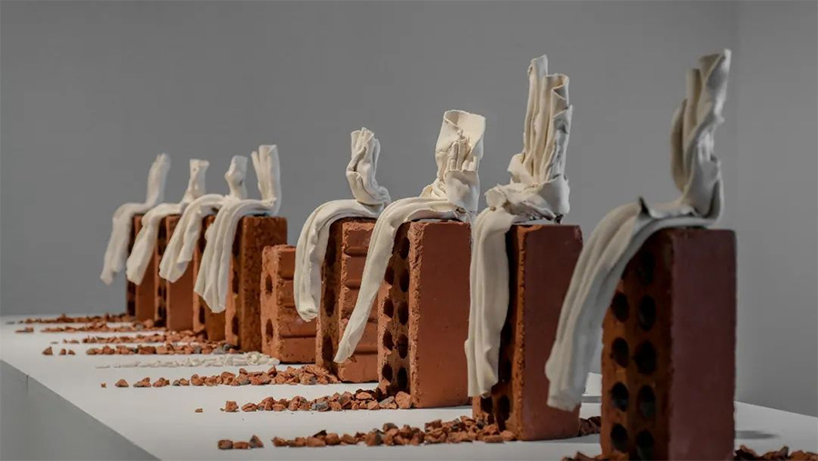 坐像之下的红砖本是粗糙的建材,在其中挖孔也是出于实用与经济的考量,却在形式上产生了特殊的趣味。砖块能堆垒广厦万间,这象征着人生在世的功业。他利用物料的特性配合两种形象去发挥瓷土与砖石的个性:一红一白、一粗一细、一刚一柔,一个说事、一个说人。这些物料是创作的媒介载体,其本身同时也承载讯息,无论什么土块构成形象,终将又崩解为物质本身。化灿烂归于平淡,这也是物质的自然常规,显尽无常,不喜不悲。