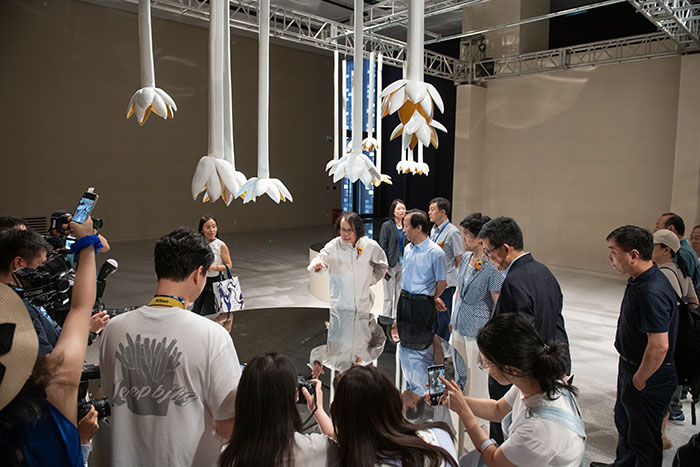 开幕式现场,观众置身这些风格与情景各异的陶瓷装置艺术场景空间中,中国器乐演奏和舞蹈表演将艺术空间激活,并加入全新的艺术语汇,在视觉与听觉艺术的交融碰撞中诞生了深具中国式美学意味的“艺术场景流”。演奏者与舞者倾情表演的同时,观众们纷纷驻足,沉浸于或悠扬或舒展的艺术表演中,体验着中国式视听艺术场景的意境之美,特别是观众在欣赏《花的精神》场景中的表演时,通过表演者身后的镜面,观众们的身影也融入到该艺术场景中。由此,作品、演者、观者之间合力构建了一个综合形态的审美空间。