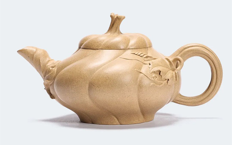南瓜壶是紫砂壶中很经典的一款器型是花塑器和筋纹器的结合该作构思和谐巧妙取材自然,雅而...