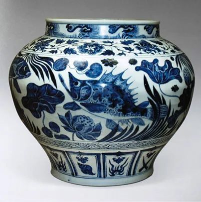直到永乐、宣德时期,青花绘画才有所改变,开始出现气象,一个时代的陶瓷能反映出这个时代的气象。将元青花的大碗和明永乐时期的青花大碗进行对比,可以看出元青花缠枝莲有钝笔、方笔,枝条一笔一笔推出,而明永乐时期的枝条一笔带过。明代的青花线条曲线均匀,变化比较少,逐步走向工艺,所谓工艺就是将其程序化、模式化。