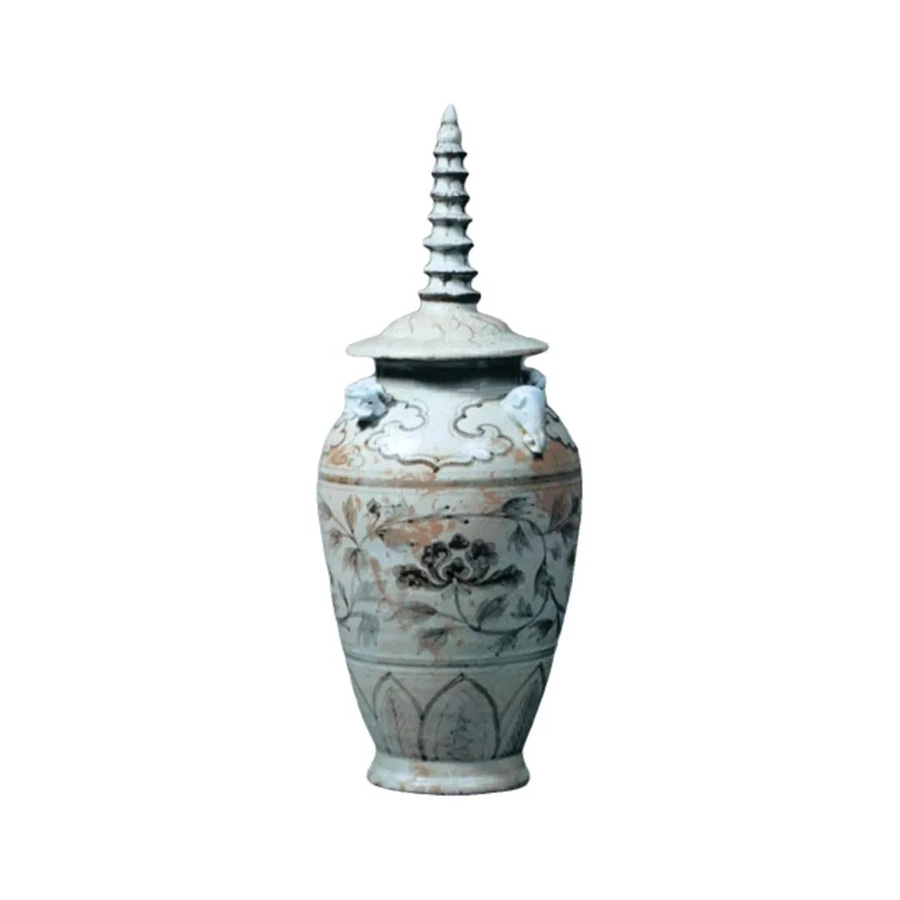 下图是元代釉下彩绘瓷罐,罐身绘有元青花经典牡丹缠枝莲图案,构图也是常见元青花的构图。起初大家都认为这是元青花瓷罐,直到上海专家化验检测发现绘画颜料不含氧化钴,证实瓷罐不是元青花器物。瓷罐图案黑中带有淡蓝与磁州窑器物图案的黑不同,因此,推测瓷罐是南下的磁州窑系工匠,在没有苏麻离青的情况下,使用含氧化铁的颜料在泥坯上所绘的前期元青花。